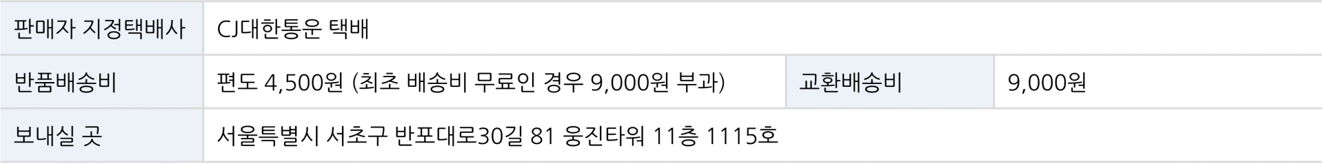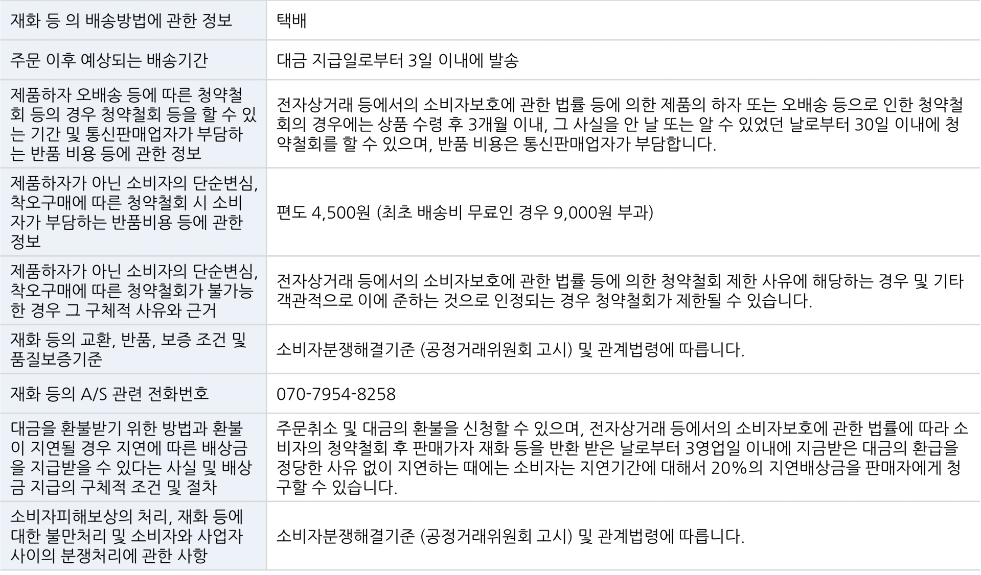 반품/교환에 관한 일반적인 사항은 판매자 제시사항보다 관계법령이 우선합니다.